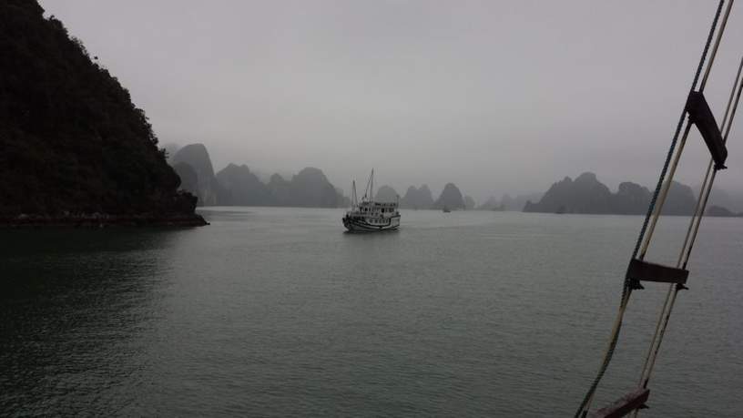 Groot was daarom de vreugde toen we het bericht kregen dat we met wat vertraging alsnog uit zouden varen. Eenmaal op het water werd het iets lichter en rezen de bekende grillige rotsen, mysterieus door de mist omhuld, op uit het water. Het was prachtig, op een heel andere manier dan ik verwacht had. De zon deed zijn best om door het wolkendek heen te breken en door een wazig zonnetje heen zag ik in de verte zelfs een jonk!