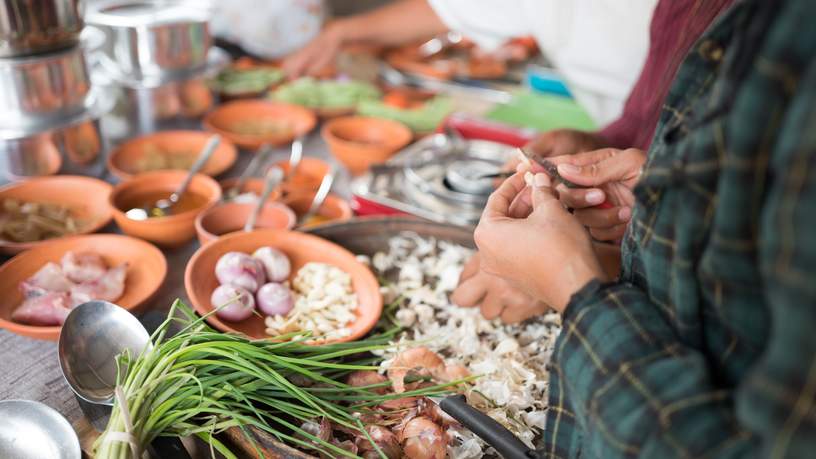 Wie houdt er nou niet van lekker eten? Na het ontbijt neemt de gids me mee naar de lokale markt. Een kleurrijke en levendige plek waar van alles te zien, en vooral te ruiken is. De gids vertelt me van alles over de producten die op de markt te vinden zijn. Wat zie ik een hoop groente en fruit waar ik nog nooit van gehoord heb! We slaan onze ingrediënten in waarmee ik later mijn eigen lunch ga bereiden. Ik word hartelijk ontvangen door de gastvrouw die me uitleg geeft over het bereiden van mijn lunch. Een gezellige bedoeling met een goed geslaagde lunch als resultaat. De "Three Good Spoons" organisatie is een sociale onderneming die kooklessen geeft aan toeristen en inwoners van Yangon. De winst die hieruit voortvloeit, gaat naar de financiering van gratis lessen hygiëne, voeding en koken die worden aangeboden aan kansarme en werkloze vrouwen.