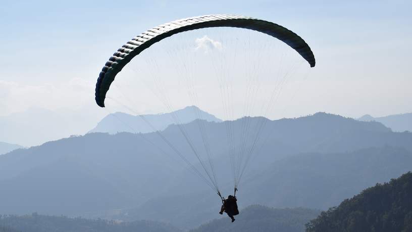Tijdens ons bezoek aan Bandipur besluit mijn reisgenoot om van een van de vele heuvels te gaan “springen”. Hij gaat paragliden! Die middag is het prachtig weer met strakblauwe luchten, zoals tijdens onze hele reis. Om half twee melden we ons bij het kantoor en is het wachten op de instructeurs. Ze komen uit Pokhara waar hun hoofdvestiging is en nemen, omdat het een zondag is, hun hele familie mee. Voordat we het weten staan we met tien man boven op de heuvel.