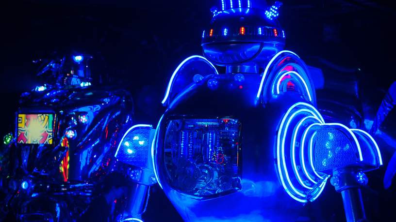 Shinjuku is the place to be. Tussen alle neonverlichting zijn de robot restaurants niet te missen. Er worden elke avond vanaf 16:00 uur, vier shows opgevoerd. Zorg dat je er snel bij bent want de shows zijn gauw uitverkocht. De hele ruimte is een en al bling bling, met over-the-top decoratie en daarom juist een must-see. Voordat de show begint drinken we een drankje in de zeer blinkende decoratieve wachtruimte. Er komt een ‘robot band’ met zangeres optreden. Ze spelen een relaxed nummer. Een leuke opwarmer.