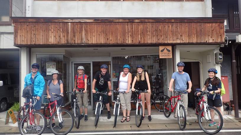 Een fietstocht door de rijstvelden bij het dorp Hida Furukawa was ook één van de hoogtepunten. Het regende weliswaar een beetje maar de temperatuur lag toch nog tussen de 25 en 30 ˚C. Met een groepje van zeven medereizigers en een goed Engelssprekende gids hebben zijn we drie uur onderweg geweest. Pluspunt om te beginnen was dat de fietsen groot genoeg waren voor ons Europeanen. Het fietsen wordt afgewisseld met stops, waarbij verteld werd over bijvoorbeeld rijstteelt en sake. Opvallend is dat je de fiets niet zomaar ergens even kunt neer zetten. Er zijn speciale fiets parkeerplaatsen. Anders wordt het maar een rommeltje natuurlijk. Hoe landelijk en vriendelijk het is bleek wel toen we zomaar werden uitgenodigd door een mevrouw, die in haar moestuin bezig was en ons wilde trakteren op een paar vers geplukte kleine komkommertjes.