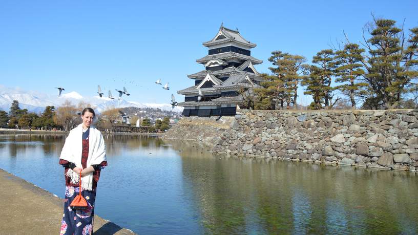 Mijn laatste stop in het Alpengebied is de stad Matsumoto. Omgeven door hoge bergen en vele fruitplantages ligt het vlakke Matsumoto met haar bekende zwarte kraaien kasteel. De Japanners zijn uiterst trots op de constructie van het gebouw, bestaande uit zes verdiepingen. Op mijn sokken beklim ik de steile trappen en bewonder de enorme houten balken die het kasteel staande houden. Vanaf de bovenste verdieping aanschouw ik het panoramische uitzicht over Matsumoto.