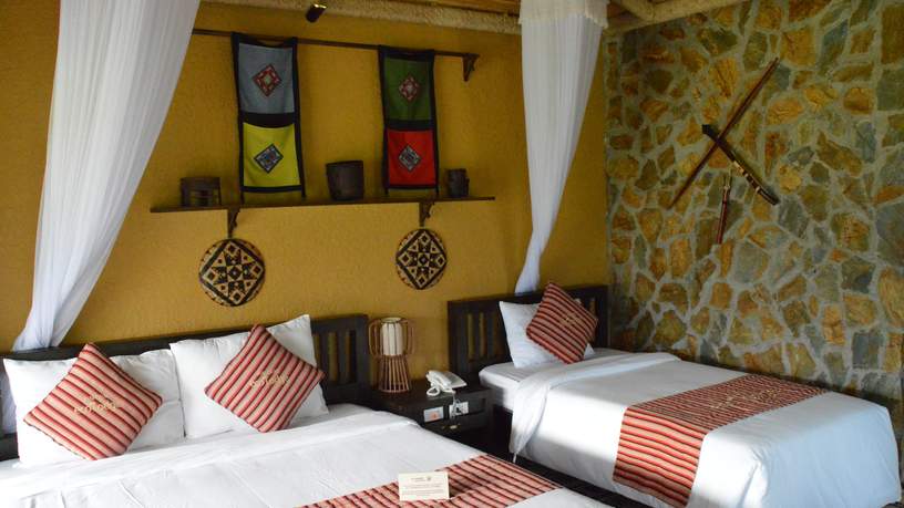 Een nacht mag ik verblijven in deze ecologische accommodatie. Ik voel me vereerd. De bouwstijl van het ‘resort’ fascineert me. Alles is gebouwd met materialen uit de omgeving. De receptie, de bar en alle bungalows staan op palen en zijn gebouwd van bamboo en hout, net als de lokale paalwoningen in het dorp. Een H’mong dame gaat me voor naar mijn huisje.