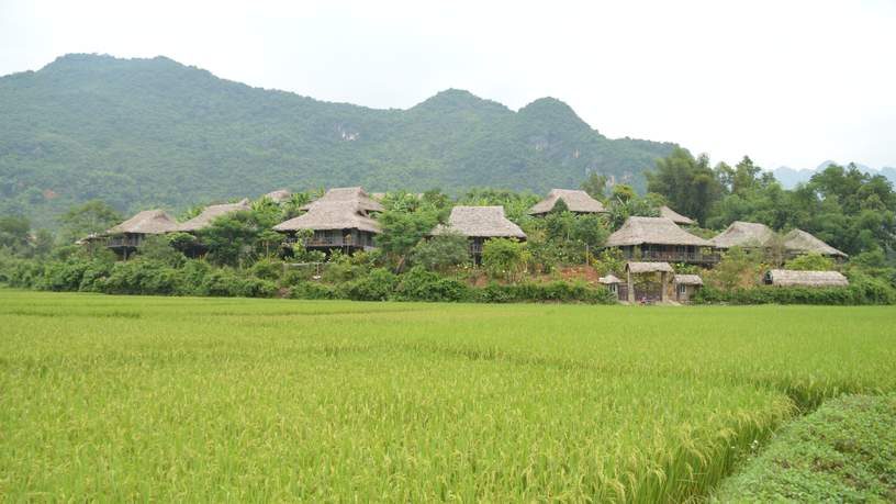 We rijden het dal in. De kleine paaldorpjes en de rijstvelden komen steeds dichterbij. Tussen de groene velden door zie ik in de verte Mai Chau Eco Lodge liggen. Precies zoals op de eerder ontvangen folder. Bungalows met rieten daken rijzen boven de rijstvelden uit. Een prachtig gezicht. Bij aankomst word ik hartelijk begroet door een dame van de bevolkingsgroep de witte Thai. Ze neemt me mee over kleine paadjes naar de receptie. Ik word verwelkomd met een sapje en een verfrissend handdoekje.