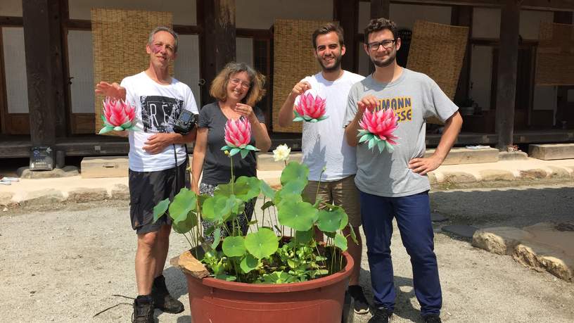 Na de thee was het tijd voor een laatste programma onderdeel: lotus-lantarentjes knutselen! Niet iedereen stond te springen van enthousiasme, maar er was geen ontkomen aan, het hoorde er gewoon bij. Het was duidelijk bedoeld als ontspannen ambachtelijke meditatieve bezigheid, een soort creatieve therapie. Het aller grappigst was wel dat in het zaaltje, waar we op de grond zaten te knutselen in een goeddeels lege ruimte, de hele tijd een zacht brommende stofzuigerrobot rondreed die geregeld tegen op ons opbotste, alvorens weer een andere hoek van de kamer op te zoeken. Ik vond het bizar, een beetje een contradictie in deze omgeving van traditionele eenvoud. Maar onze begeleidster keek er helemaal niet van op. Misschien had ik het toch nog niet helemaal begrepen..... traditie, eenvoud, tijdloos..... dus waarom geen gebruik maken van moderne middelen om het leven gemakkelijker te maken? Hoe dan ook, het resultaat van ons plakwerk was natuurlijk geweldig, en aanleiding voor een groepsfoto ter herinnering aan ons Zuid-Koreaanse temple stay-avontuur.