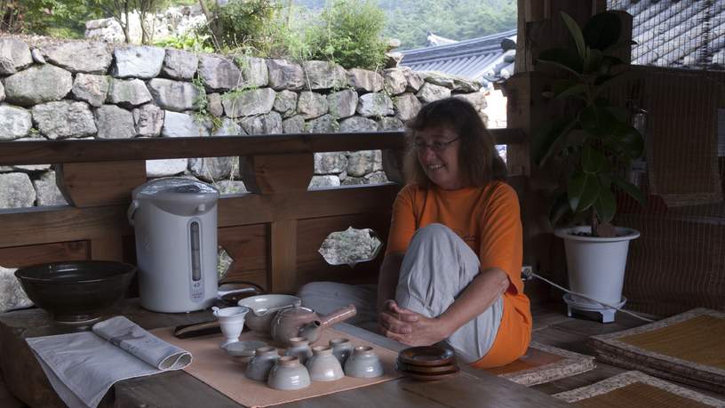 Het was een heel avontuur om er te komen, eerst een stuk per trein en dan verder met achtereenvolgens twee streekbussen. Het klooster lag in een prachtige beboste bergvallei. We wandelden de toegangspoort door en belandden in een oase van rust. Een medewerkster van het klooster ontving ons allerhartelijkst. Gelukkig sprak ze net voldoende Engels om ons wegwijs te maken en de kloosterregels uit te leggen. Zo moesten we ons omkleden in een setje verplichte tempelkledij (wijde grijze broek, wijd oranje t-shirt en tempelschoentjes) en drukte ze ons op het hart om ons te houden aan de exacte tijden van de programma onderdelen. Bijvoorbeeld: ochtendceremonie in het hoofdgebouw van de tempel om 04.30 uur in de ochtend...... We kregen een prettige privé-kamer Koreaanse stijl (dun matje op keiharde vloer) toegewezen, met eigen badkamer en veranda! We waren niet de enige gasten. In de kamer naast ons logeerde een oude Koreaanse dame met haar dochter, en later voegden zich nog twee buitenlandse studenten uit Seoul bij het gezelschap. Om exact 17.40 uur dineerden we samen met het kloosterpersoneel en enkele monniken in de kloosterkantine, uiteraard vegetarisch. Daarna konden we op onze veranda genieten van de krekeltjes, en om 21.30 uur onherroepelijk lichten uit en slapen!