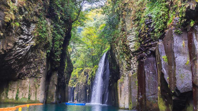 Dag naar eigen inzicht in te vullen. Een van die spirituele plekken is de Takachiho Gorge, een smalle kloof met steile basalt rotswanden waar de ongerepte Gokase rivier zijn weg door baant. Met een roeiboot kun je zelf een stukje door de kloof varen en een kleine waterval vanuit het water bekijken. Ook is er een 600 meter lang wandelpad met prachtig uitzicht van bovenaf. In ieder seizoen is dit een plaatje om te zien.